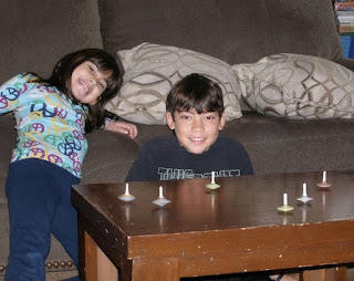 The really fun part of the holiday was that the kids found just as much fun in old-fashioned toys as they did in new electronic games! I made six small spin tops with colorful chatter work on both sides, top and bottom: