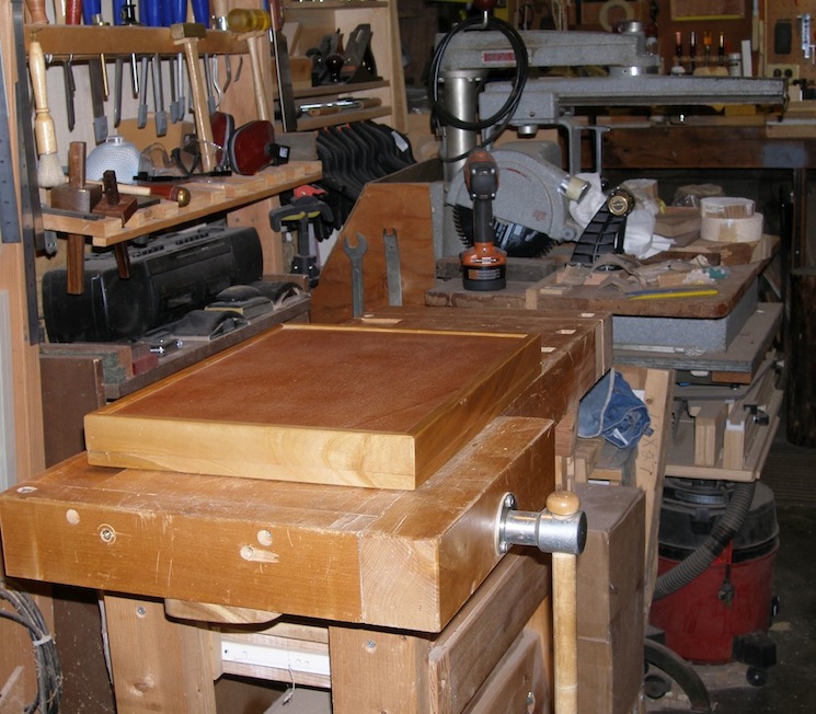 It is french-fitted to loosely hold three grits of oilstones and is simple to just lift up onto the bench to work with, or to any other flat surface not buried under wood blanks or other tools at the time I need to sharpen chisels or plane irons or carving gouges.